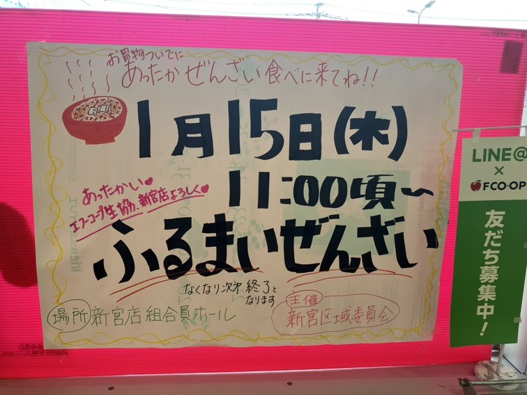 イベント・活動 イベントレポート一覧 総合TOP イベント・活動 イベントレポート イベントレポート一覧 1月15日 新宮店盛上げ隊(ぜんざい会開催) 食のとりくみ 環境のとりくみ 環境 地域とともに 2026年01月16日 1月15日 新宮店盛上げ隊(ぜんざい会開催) 開催日/2026年1月15日 新宮店盛り上げ隊(ぜんざい会) 1月15日(木)、新宮店で恒例の「鏡開きぜんざい会」を開催しました。 寒い季節にぴったりの温かいぜんざいを楽しみに、開始前から組合員さんがずらり! 北海道産小豆を使ったコープの「ゆで小豆」と、食べやすくカットしたお餅を準備し、メンバーは朝9時30分から大忙し。 提供開始の11時前には長い列ができ、100食限定のぜんざいはあっという間に完売しました。 試食会場では、 「甘くておいしい!」と笑顔が広がり、店内アナウンスの効果もあって会場は大盛況。 終了予定の12時過ぎにはすべて提供し終えるほどの人気振りでした。 前の記事へ 次の記事へ 一覧へ戻る Event informationおすすめのイベント情報 情報をおさがしですか?