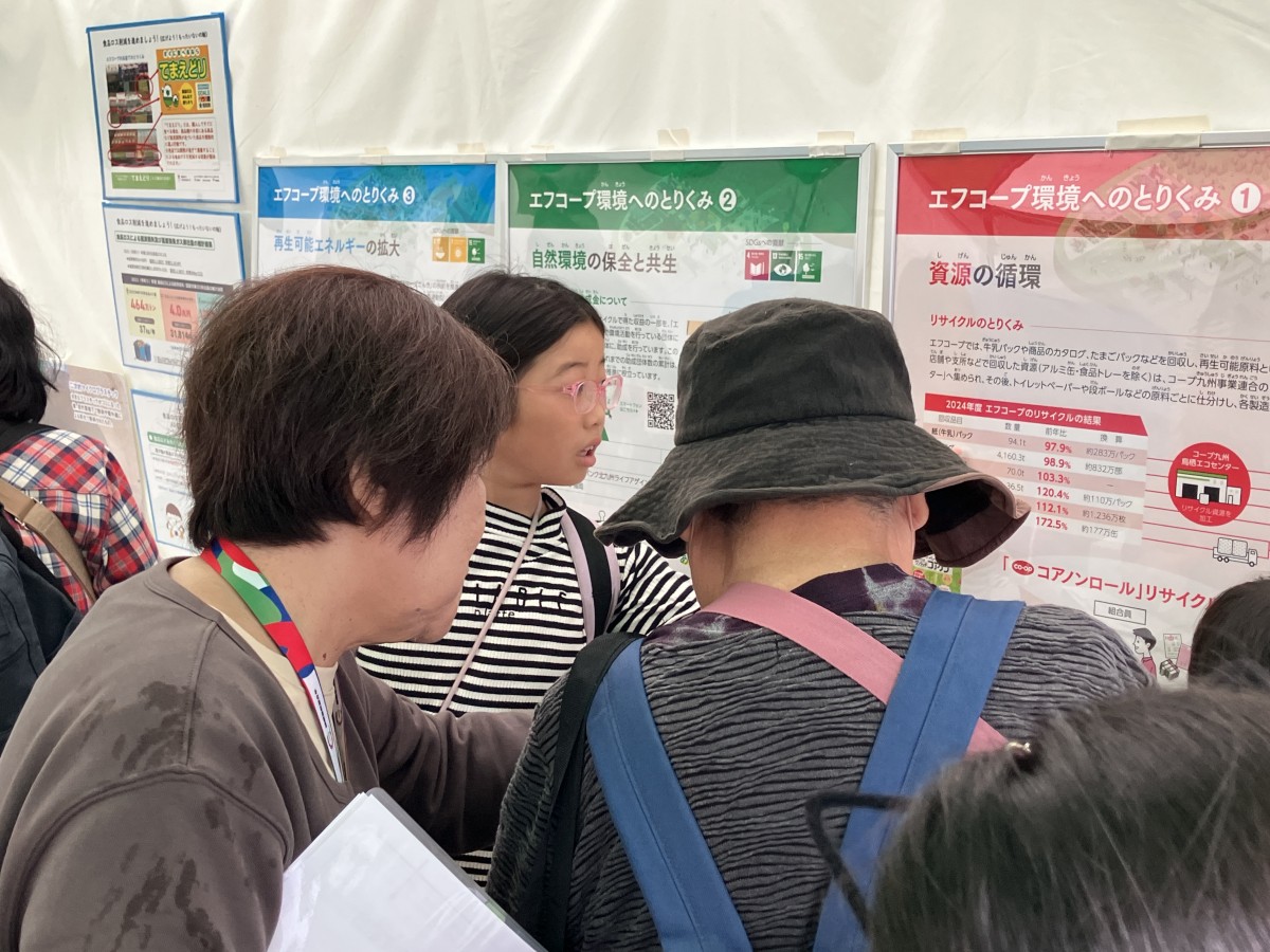エフコープは両日とも「チャレンジ 環境クイズ!」をテーマにブース出展しました。エフコープにおける環境のとりくみパネルを見ていただきながら、クイズに挑戦していただきました。食品ロスによる1人あたりの経済的損失の年間額に驚かれる方や、海洋プラスチックごみ問題を身近な問題と感じていただける方が多くいらっしゃいました。