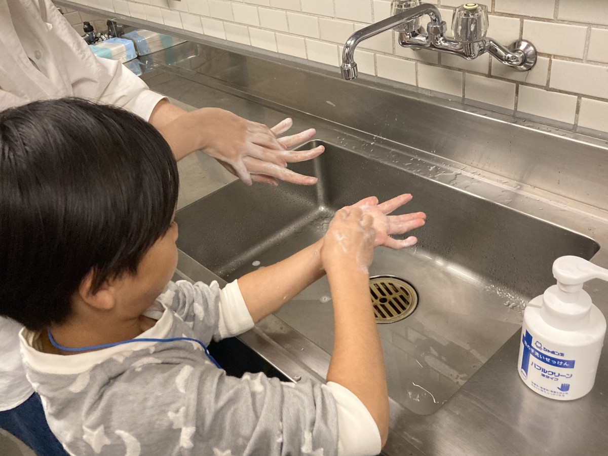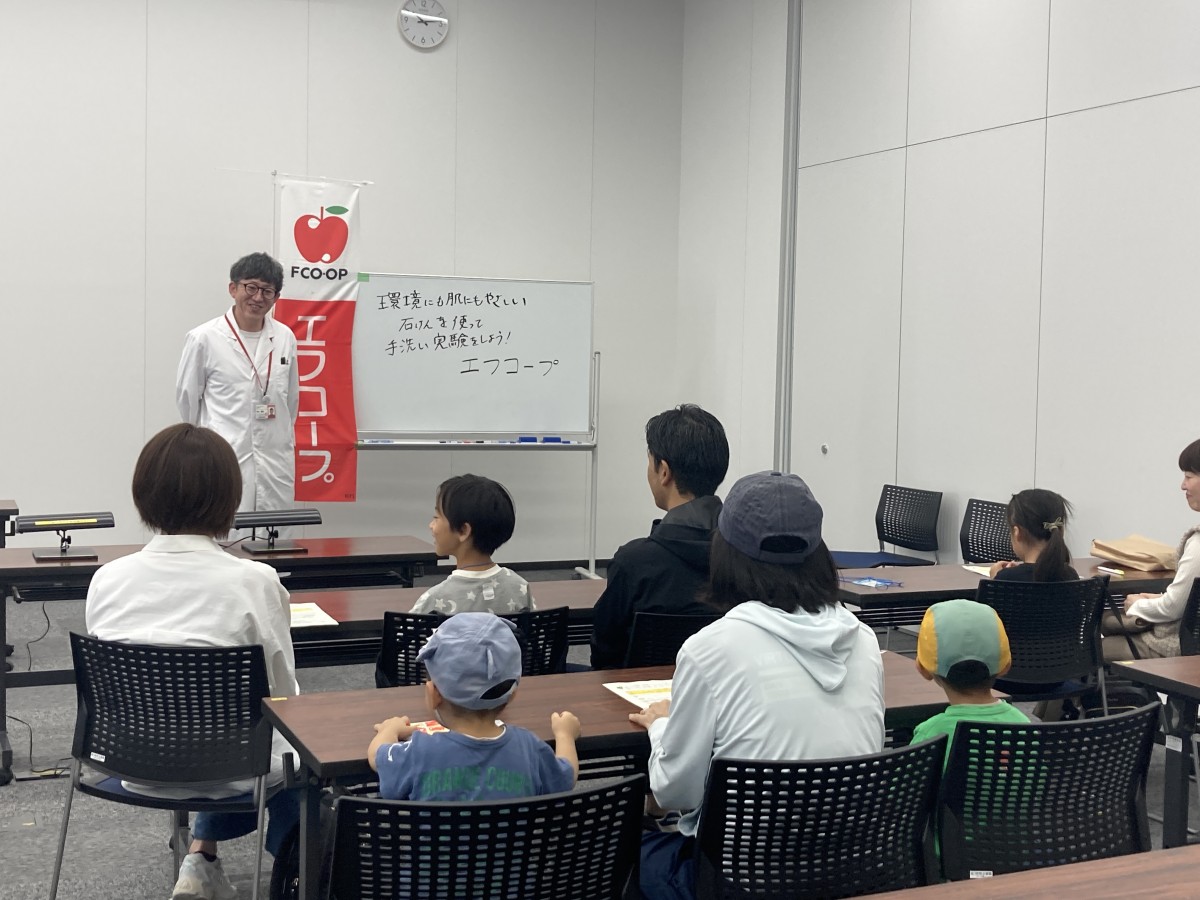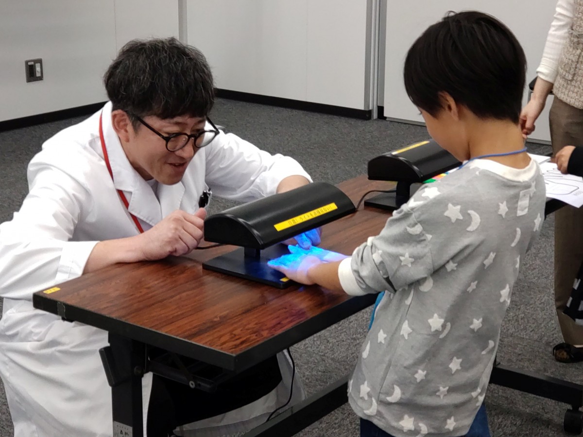 26日は商品検査センターのスタッフを講師に迎えたワークショップ「環境にも肌にもやさしい石鹸を使って手洗い実験をしよう!」も開催しました。ローションを汚れとみなし、普段の手洗いの仕方でどのくらい汚れが落ちているのか、ブラックライトを使い手洗い前後で比較しました。その後、正しい手洗い方法を教わり、再度、手を洗って、残りの汚れがどのくらい落ちたかを確認しました。小さなお子さんも一生懸命手洗いをしていました。インフルエンザなどの感染症が流行する時期に備え、帰宅後や食事前、トイレの後、そして冷蔵庫を開ける前にもしっかりと手洗いすることを学びました。