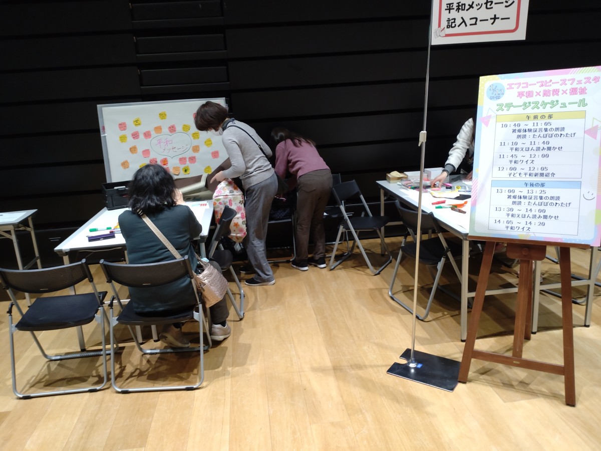 2025年は戦後・被爆80年という節目の年でした。会場のステージでは平和の大切さを次世代へつなげるため、エフコープテーマクラブ「たんぽぽのわたげ」による被爆体験証言集『つたえてください あしたへ……』の朗読、平和絵本の読み聞かせ、平和クイズ、子ども平和新聞プロジェクトの紹介を行いました。また、「原爆と人間展」や「福岡大空襲」などのパネル展示や当時の戦時品の展示に加え、平和メッセージの記入や折り鶴づくりも実施しました。参加者からは、「多くの人々が平和に関心をもってほしい」「平和をつなぐことは大切なことですね」などの声が寄せられ、改めて平和への思いを共有する貴重な時間となりました。