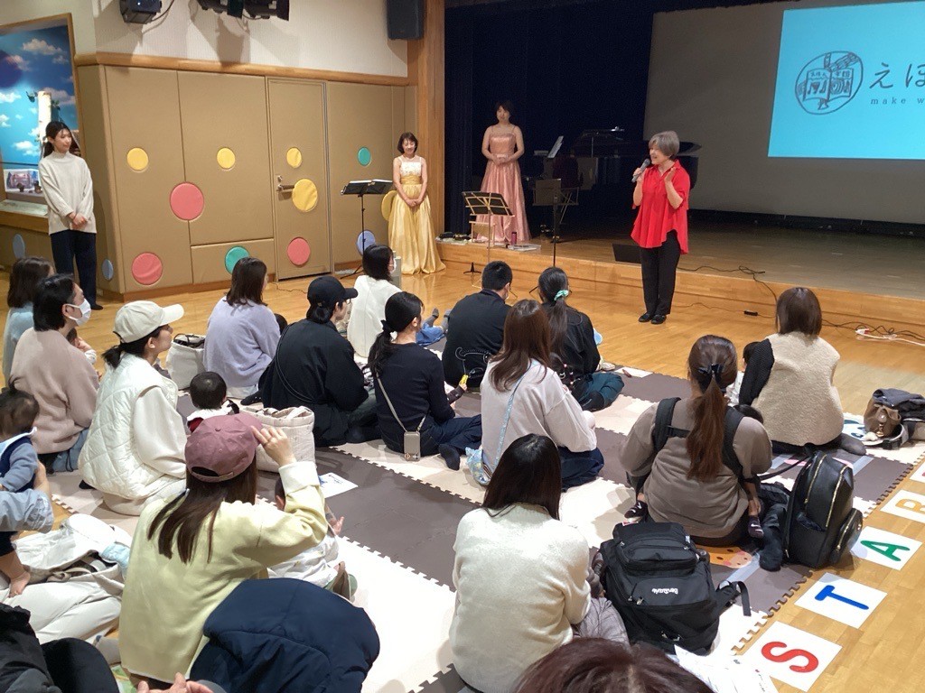 最初は、えほん楽団によるコンサートからスタートしました。絵本をスクリーンに映し、朗読とともにピアノとクラリネットの演奏、歌が融合したプログラムを実施。参加者は一緒に手拍子をしたり、楽器に触れたりしながら、五感で楽しめる参加型のコンサートを満喫しました。