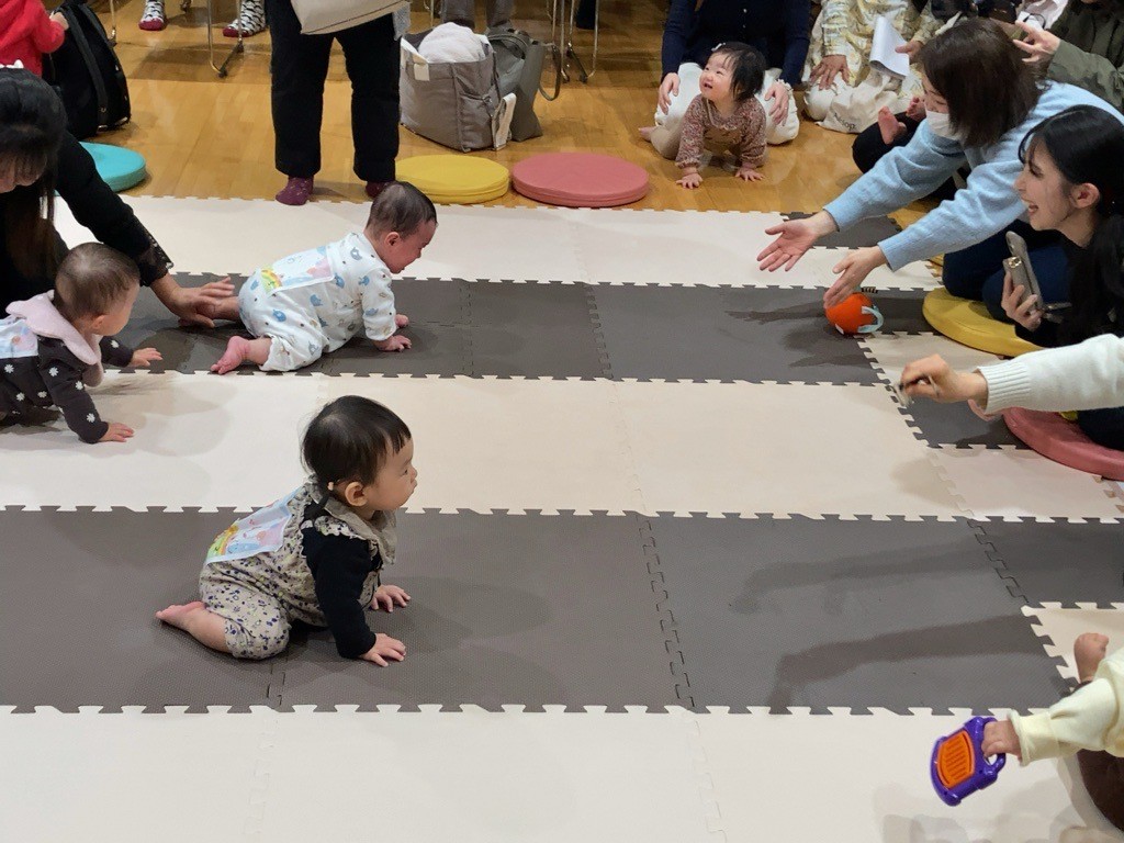 続いて行われたハイハイレースでは、ピアノの生演奏に包まれながら、赤ちゃんたちが保護者のもとへ向かってスタートしました。思うように進めない子、周囲の様子に興味を示す子、ほかのお子さんやおもちゃが気になる子、思わず泣いてしまう子など、それぞれの個性あふれる姿が見られました。会場は、そのかわいらしい姿に温かい声援と笑顔があふれ、大変盛り上がるレースとなりました。