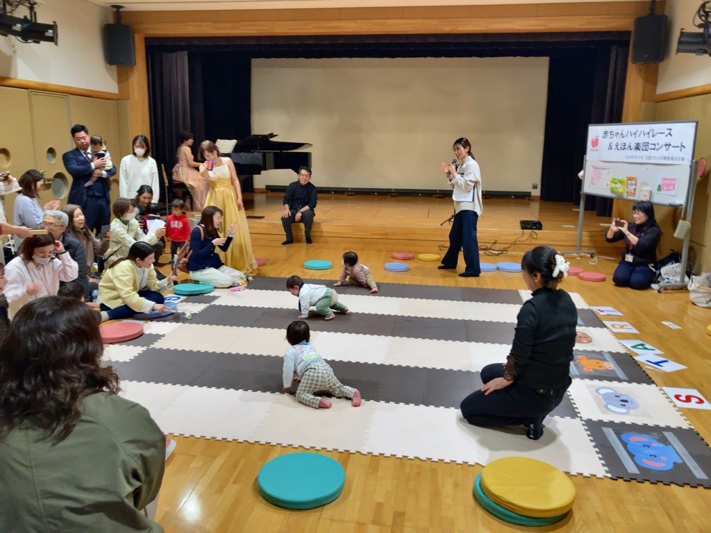 3月16日、子育てふれあい交流プラザ元気のもり「わらべホール」で、「赤ちゃんハイハイレース&えほん楽団こどもコンサート」を開催し、赤ちゃん、スタッフを含む73名が参加しました。