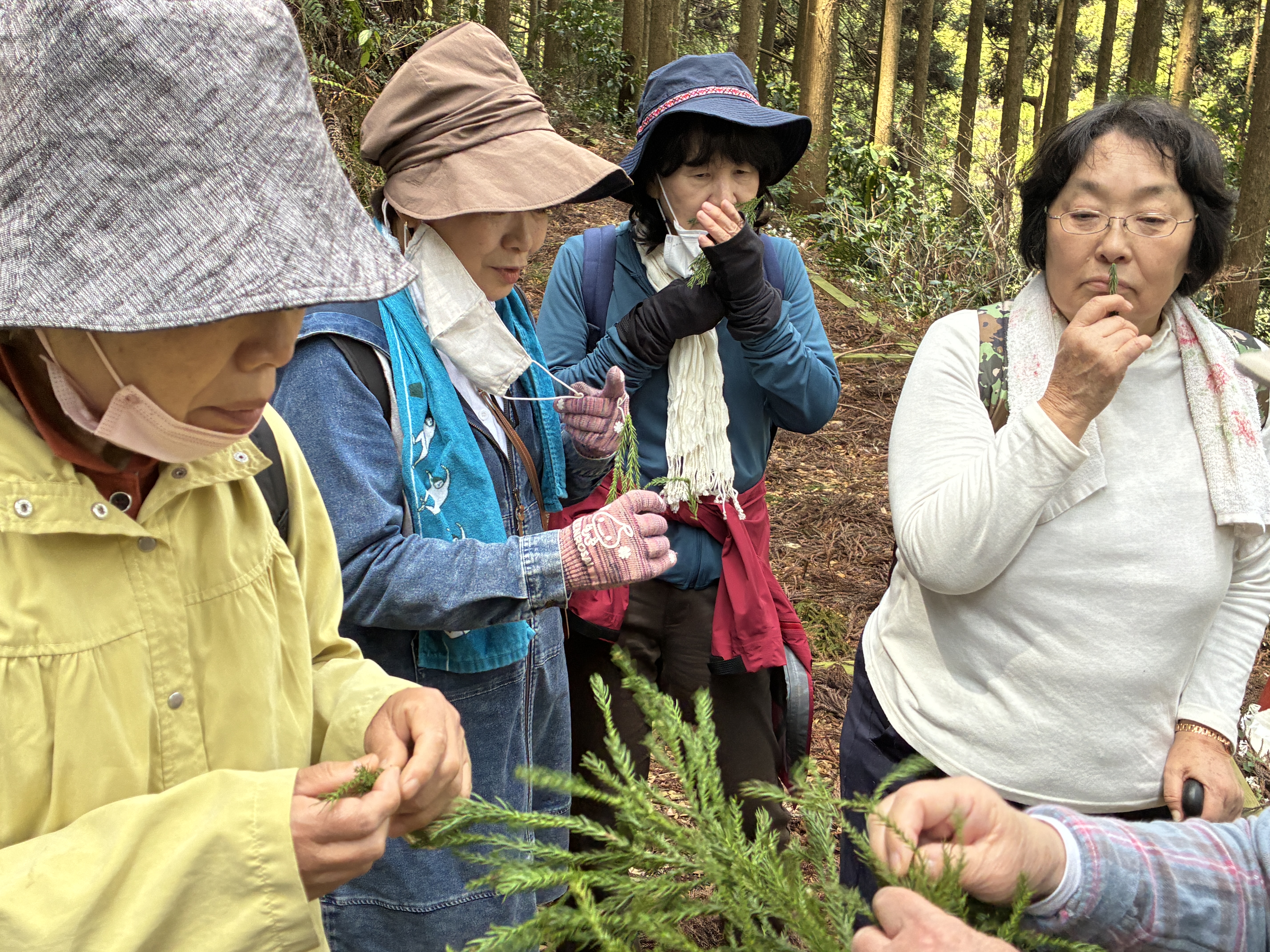 「うきは市癒しの旅先案内人」のガイドさんと一緒に、ゆっくりと山道を歩きながらマイナスイオンをたっぷり浴び、生きものや植物の説明を聞きました。また、手触りや香り、音などを通して五感で自然を感じ、ヤッホー広場では大きな声を出してやまびこ体験を行うなど、慌ただしい日常から離れ、のんびりとした時間を満喫しました。