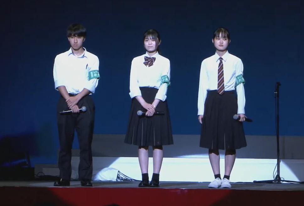 午後からは広島県立体育館グリーンアリーナに場所を移し、「ヒロシマ虹のひろば」に参加しました。前半はステージで子どもたち『ぞうれっしゃがやってきた』の歌声で始まり、被爆体験証言や高校生の描く被爆画、新聞部のとりくみ、大学生の朗読と幼稚園・小学校などが披露されました。