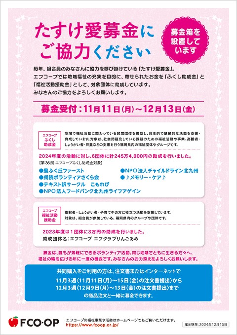 毎年、地域福祉のために「たすけ愛募金」を行っています。寄せられた募金は、「ふくし助成金」や「福祉活動援助金」として、福岡県内で福祉活動を行っている団体に助成を行っています。
